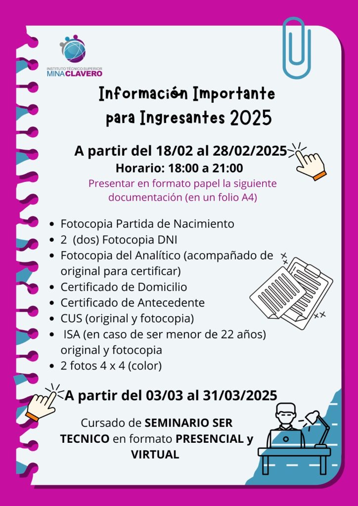Las inscripciones definitivas se completan al entregar la siguiente documentación a partir del 18 de febrero del 2025 en la institución (Hernán Cortes 1060, Mina Clavero) de 18.30 a 21 hs.